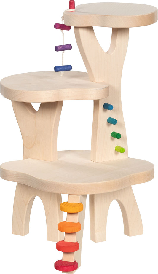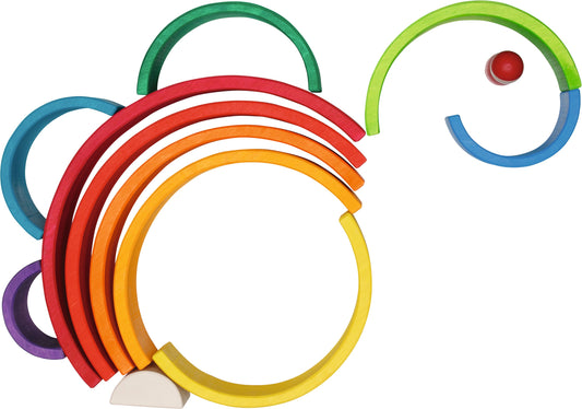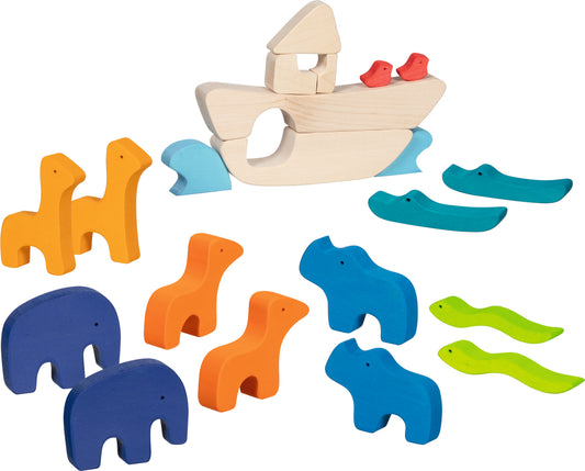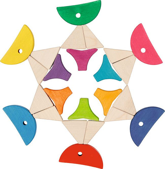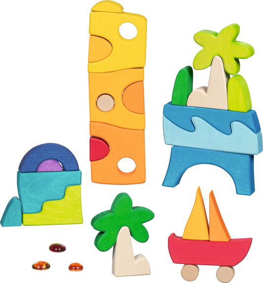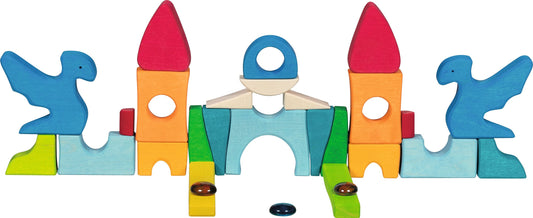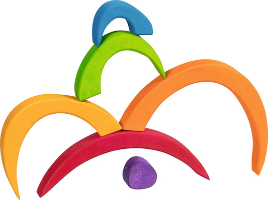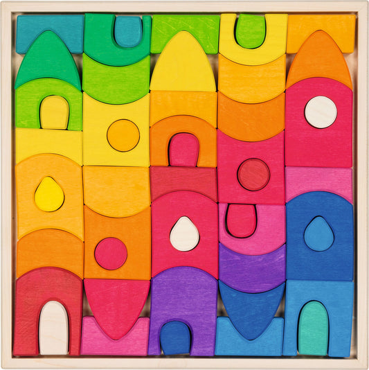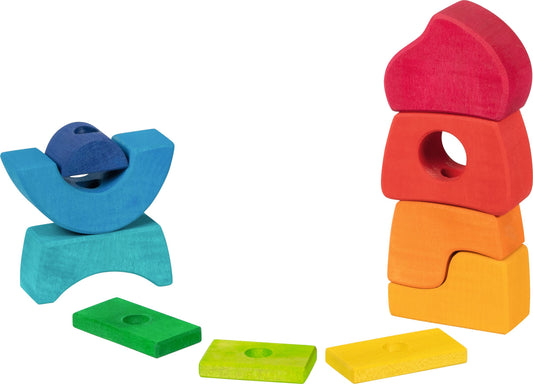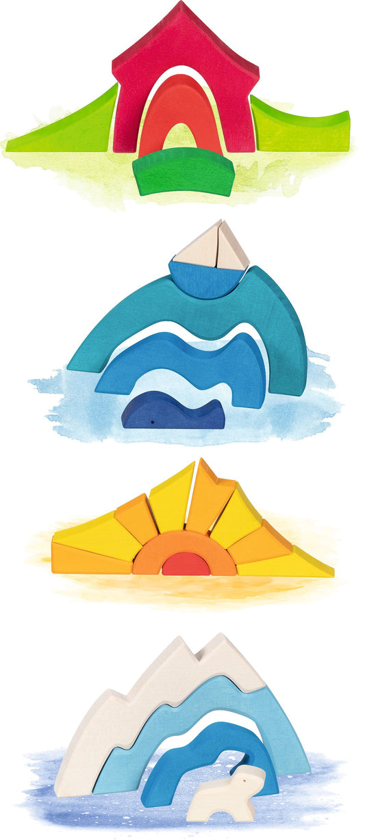 Holzbausteine,Bögen und Stapelspiele, die Kinder zu fantasievollen Bauwerken einladen.