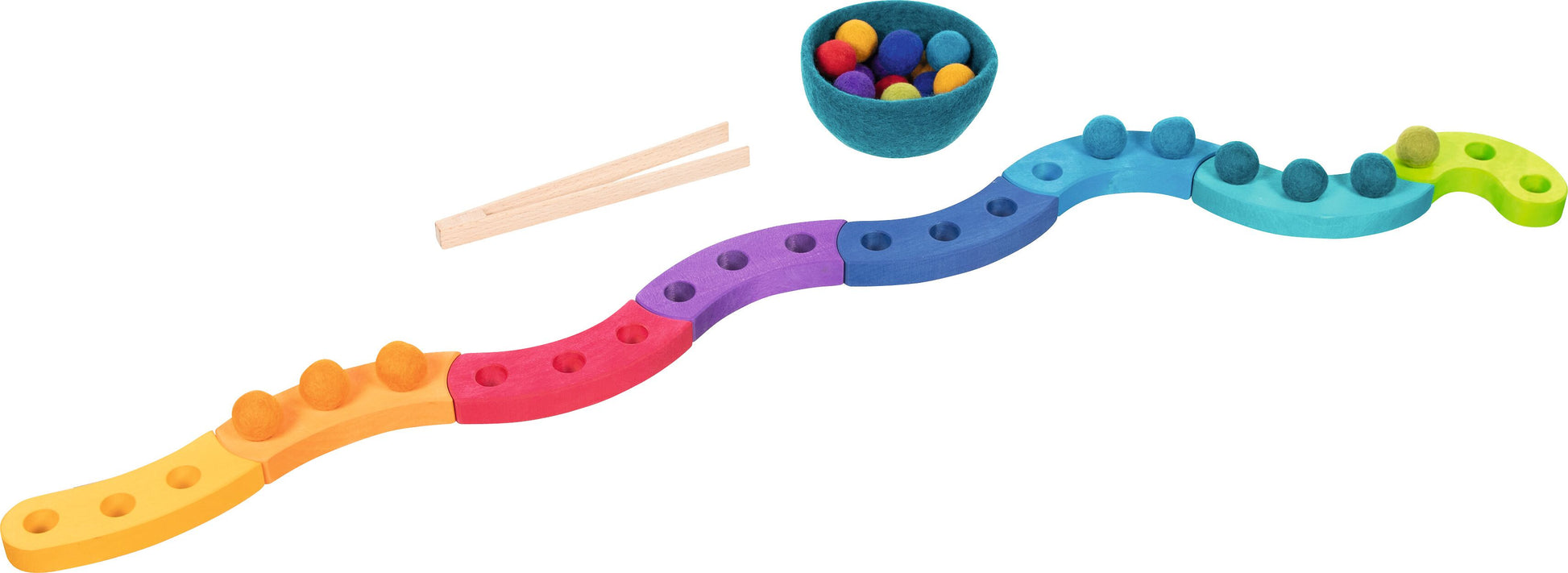 Diese achtteilige Spirale aus hochwertigem Ahornholz kann auf unterschiedlichste Weise bespielt werden. So bildet sie beispielweise ein klassisches Farbsortierspiel, bei dem Kinder spielerisch in die Welt der Farben und des Zählens eintauchen können. Das Aufnehmen und Einsortieren der Wollfilzkugeln in die passenden Mulden mit der Zange aus Buchenholz fördert die Konzentration und schult die Auge-Hand-Koordination. Zudem kann die farbenfrohe Spirale auch als Adventsspirale genutzt werden. Eine Adventsspirale ist eine Art achtsamer Adventskalender – ein besinnliches Ritual für die ganze Familie. Sie begleitet durch die Adventszeit und veranschaulicht auf kindgerechte Weise, wie viele Tage bis zum Heiligen Abend verbleiben. Dafür werden 24 Wollfilzkugeln Tag für Tag in die Mulden gelegt. Dieses Ritual lässt sich wunderbar mit einer Weihnachtsgeschichte oder dem gemeinsamen Singen verbinden. Neben diesen zwei Varianten bieten sich dank des individuellen Designs noch viele weitere Möglichkeiten des freien Spiels, die es zu entdecken gilt.