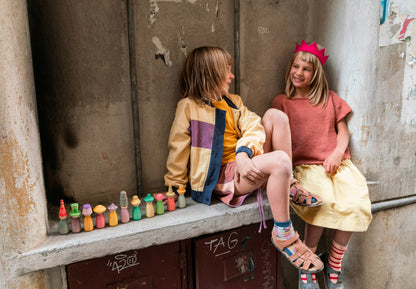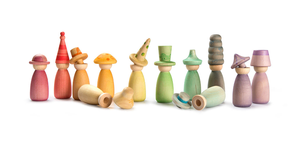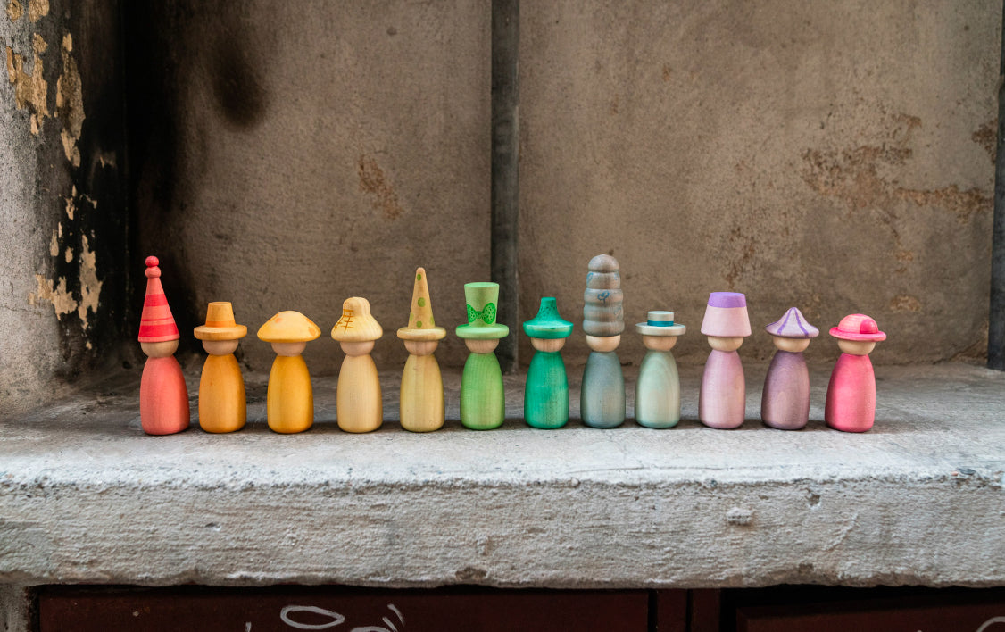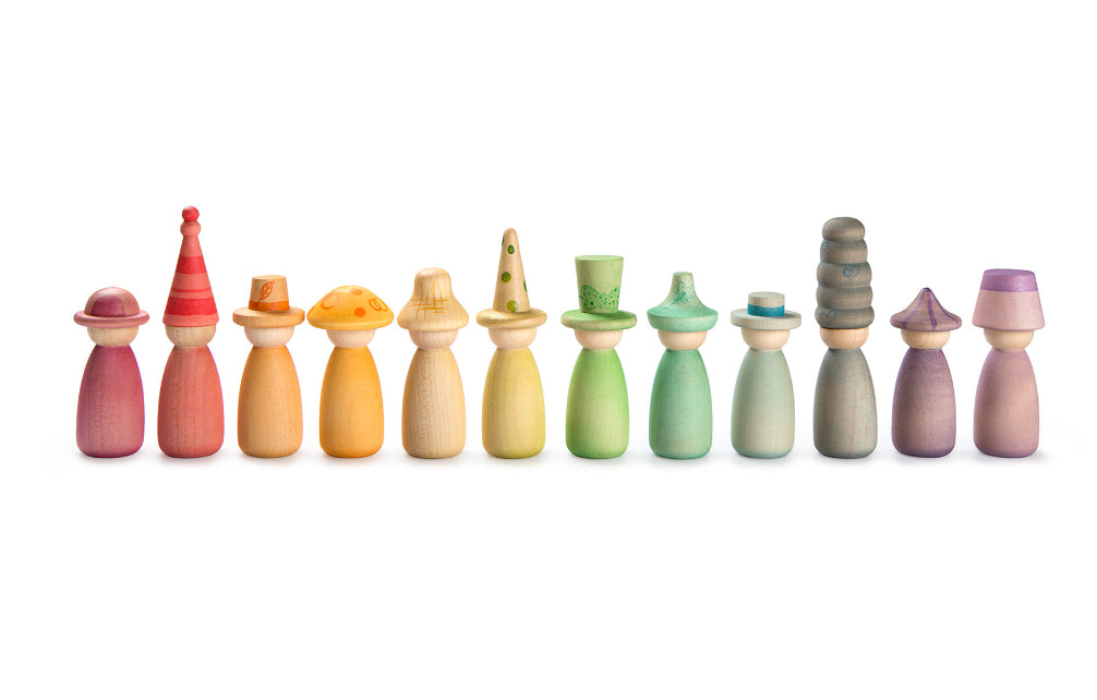 Ein farbenfrohes Spektakel aus 12 handbemalten Holzfiguren, die mit austauschbaren Hüten und Körpern bekleidet werden können. Alle „Nins“ tragen die Farben des Regenbogens und laden zum Tauschen, Verkleiden und Geschichtenerzählen ein. Durch die vielfältigen Kombinationsmöglichkeiten entstehen immer wieder neue Spielwelten und Ausdrucksformen – von freier Bastelei über Symbolspiel bis zu Farbzuordnungen und Kompositionen.