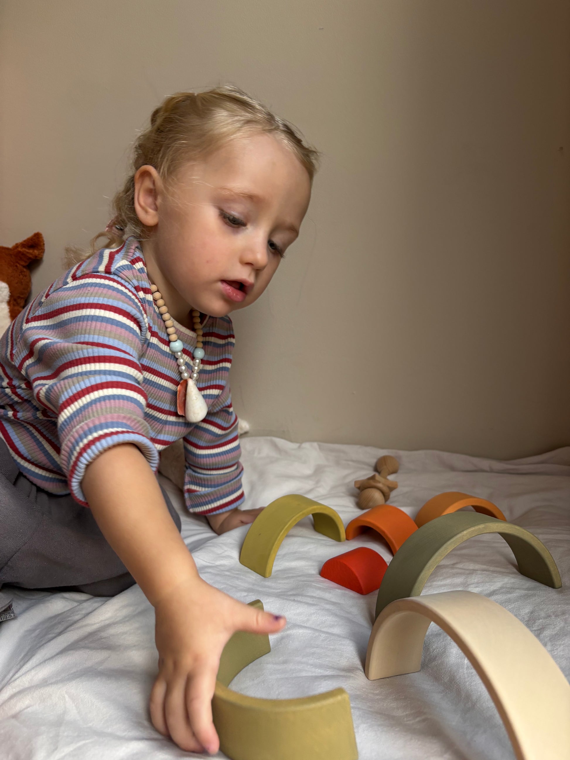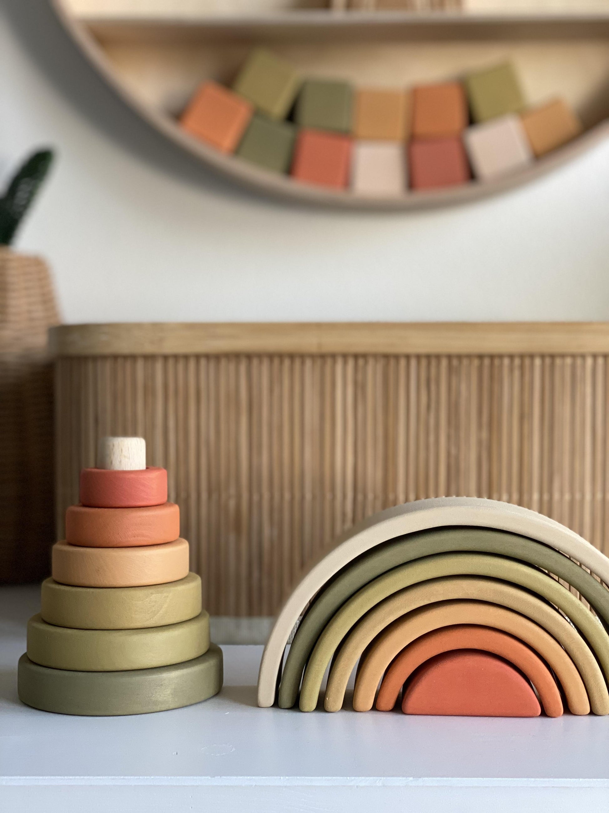 Ein Regenbogen voller Möglichkeiten – liebevoll aus Holz gefertigt, inspiriert von der Natur. Das Stapelspiel lädt Kinder zum freien Bauen, Ordnen und Entdecken ein. Spielerisch entwickeln sie dabei ihre Fantasie, Kreativität und Feinmotorik. Ob als Tunnel, Brücke oder Blumenwiese – die Bögen schenken unendliche Spielideen und begleiten durch viele Jahre.