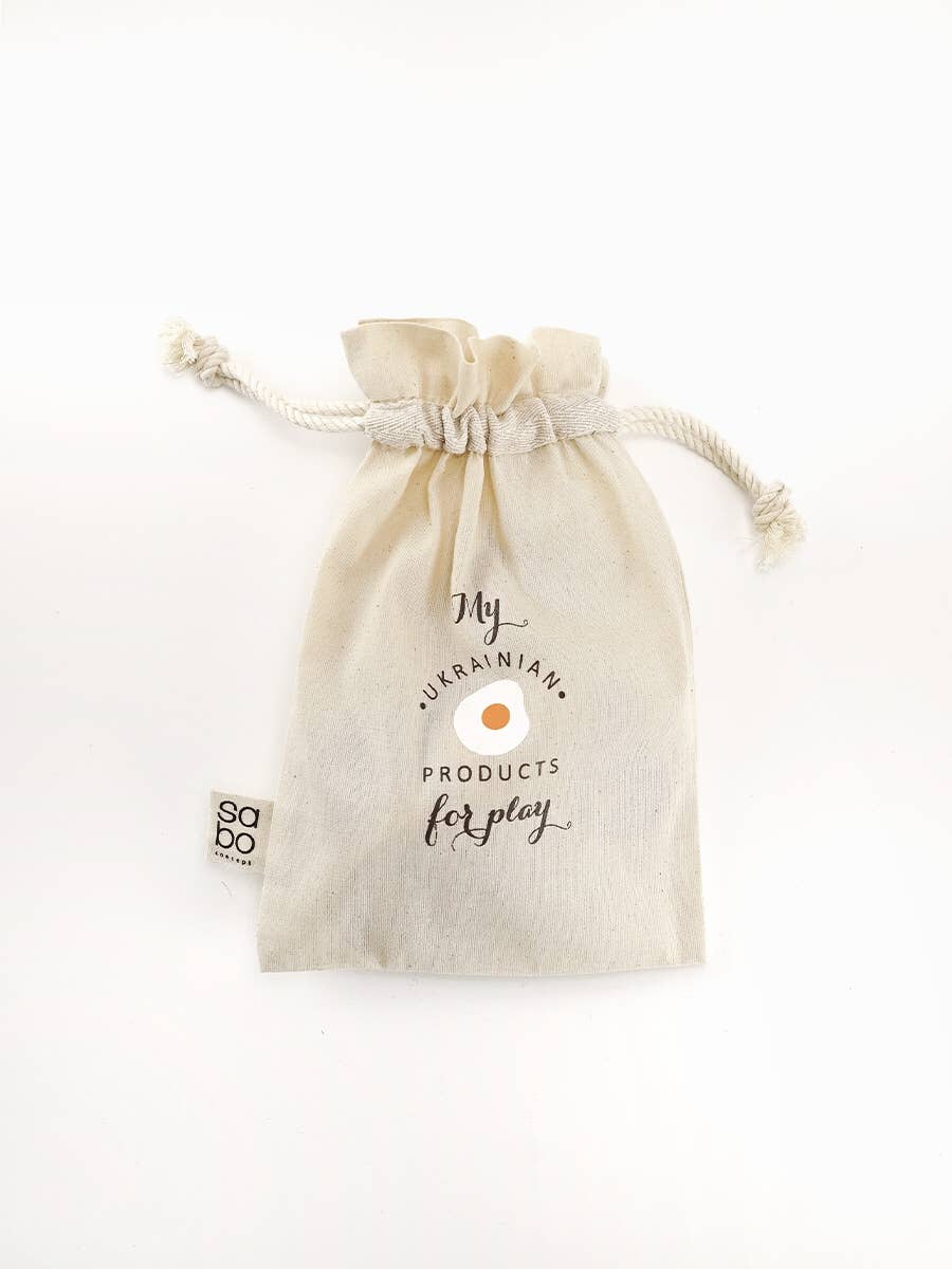 Das Set umfasst eine Flasche Milch, sechs Eier mit Tablett, ein Stück Butter, Käse, Brot und einen Leinensack zur Aufbewahrung. Alle Teile sind aus Linden- oder Birkenholz gefertigt, sorgfältig geschliffen und mit ungiftigen Farben auf Wasserbasis bemalt, sodass die natürliche Maserung des Holzes sichtbar bleibt.